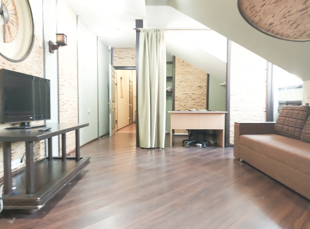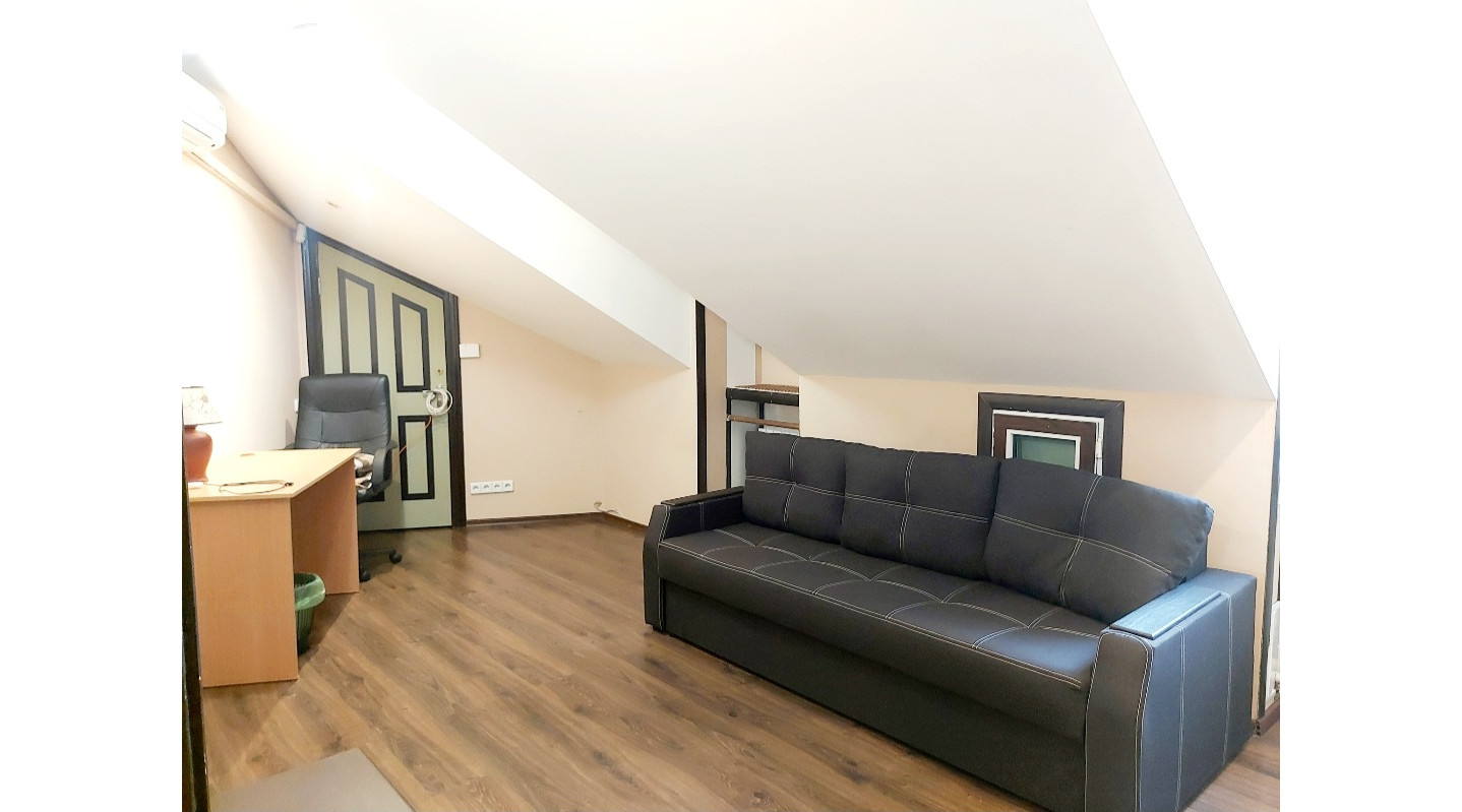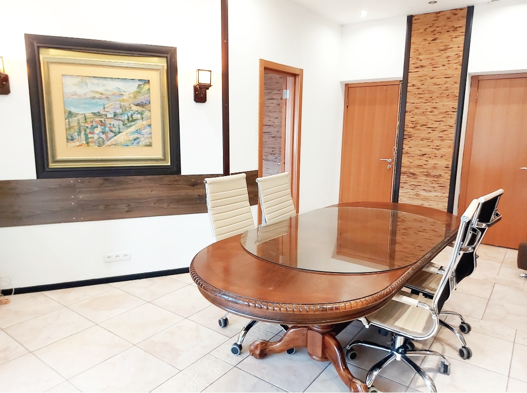 Меблі: 6 офісних столів, офісне крісло 2, 2 стільці, 6 диванів двоспальних розкладних, вбудовані шафи, двері-купе, полиці, стелажі, кухонний гарнітур, офісний великий диван.