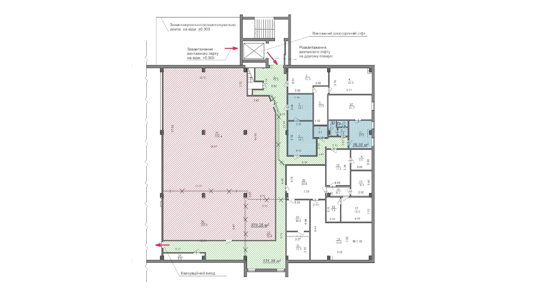 - Вантажопідйомність ліфта 3200 кг, окрема рампа